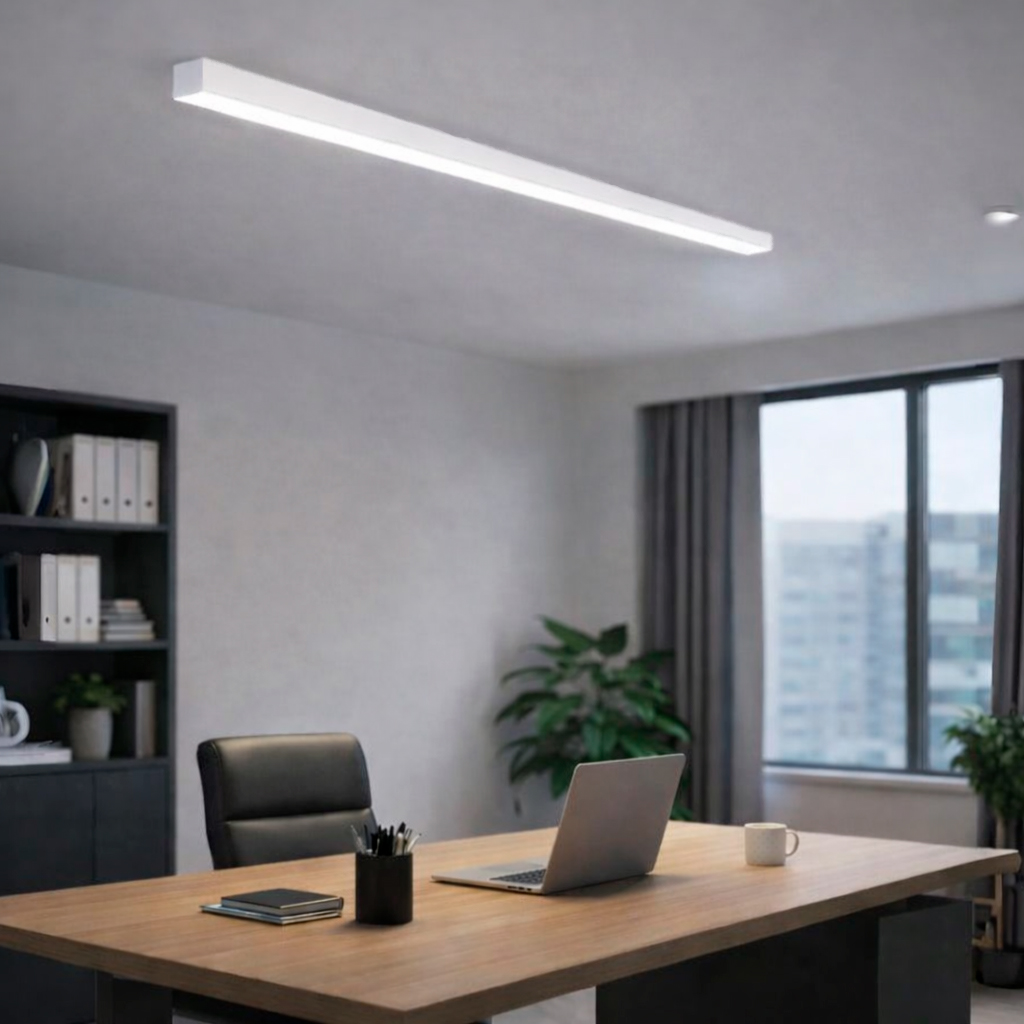 ➤ Также как и в подвесном варианте, данный светильник может быть выполнен в размерах от 1000мм до 4000мм. Доступны различные варианты цветовой температуры, от теплого белого до холодного белого, что позволяет подобрать оптимальный вариант для конкретного помещения и задач освещения, а также различные варианты расцветок корпуса. Из дополнительных опций возможна функция диммирования.