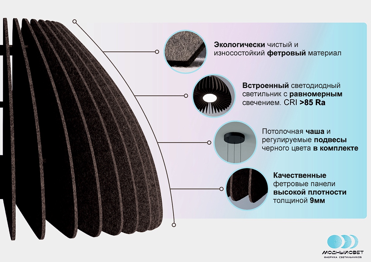 Подвесной светильник MODALINE ROUND BELL90 – это элегантное и функциональное решение для освещения вашего интерьера. Уникальный абажур, собранный вручную из мягких фетровых панелей, создает теплую и приглушенную атмосферу, рассеивая свет мягко и равномерно. Фетр не только приятен на ощупь, но и обладает отличными звукопоглощающими свойствами, что способствует созданию более комфортной акустической среды в помещении.