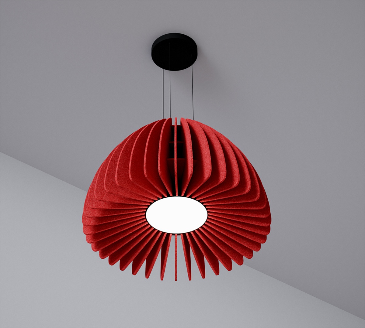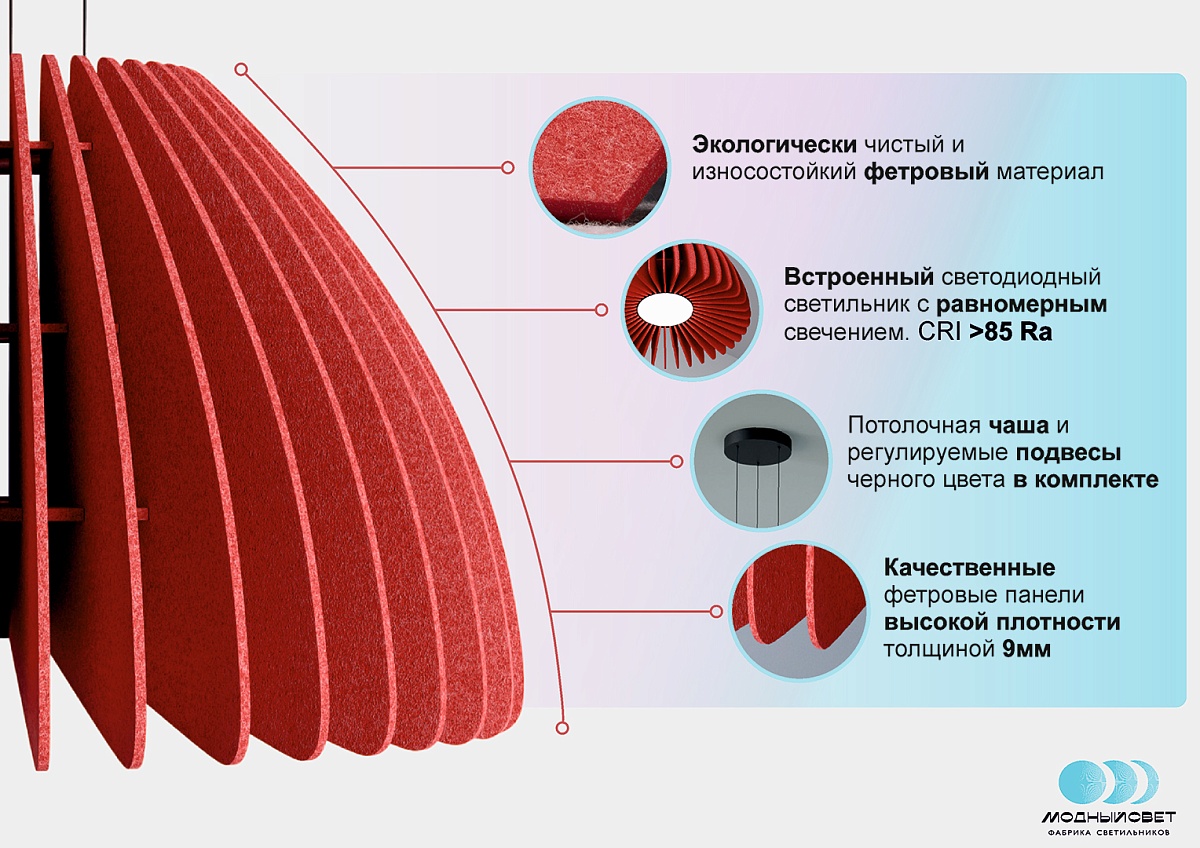 Подвесной светильник MODALINE ROUND BELL90 – это элегантное и функциональное решение для освещения вашего интерьера. Уникальный абажур, собранный вручную из мягких фетровых панелей, создает теплую и приглушенную атмосферу, рассеивая свет мягко и равномерно. Фетр не только приятен на ощупь, но и обладает отличными звукопоглощающими свойствами, что способствует созданию более комфортной акустической среды в помещении.
