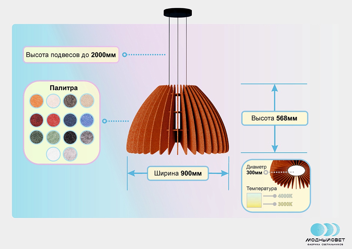 Примечание Абажур из фетровых панелей. Широкая палитра. Есть возможность переключения мощности/яркости на источнике питания. Источник питания в комплекте