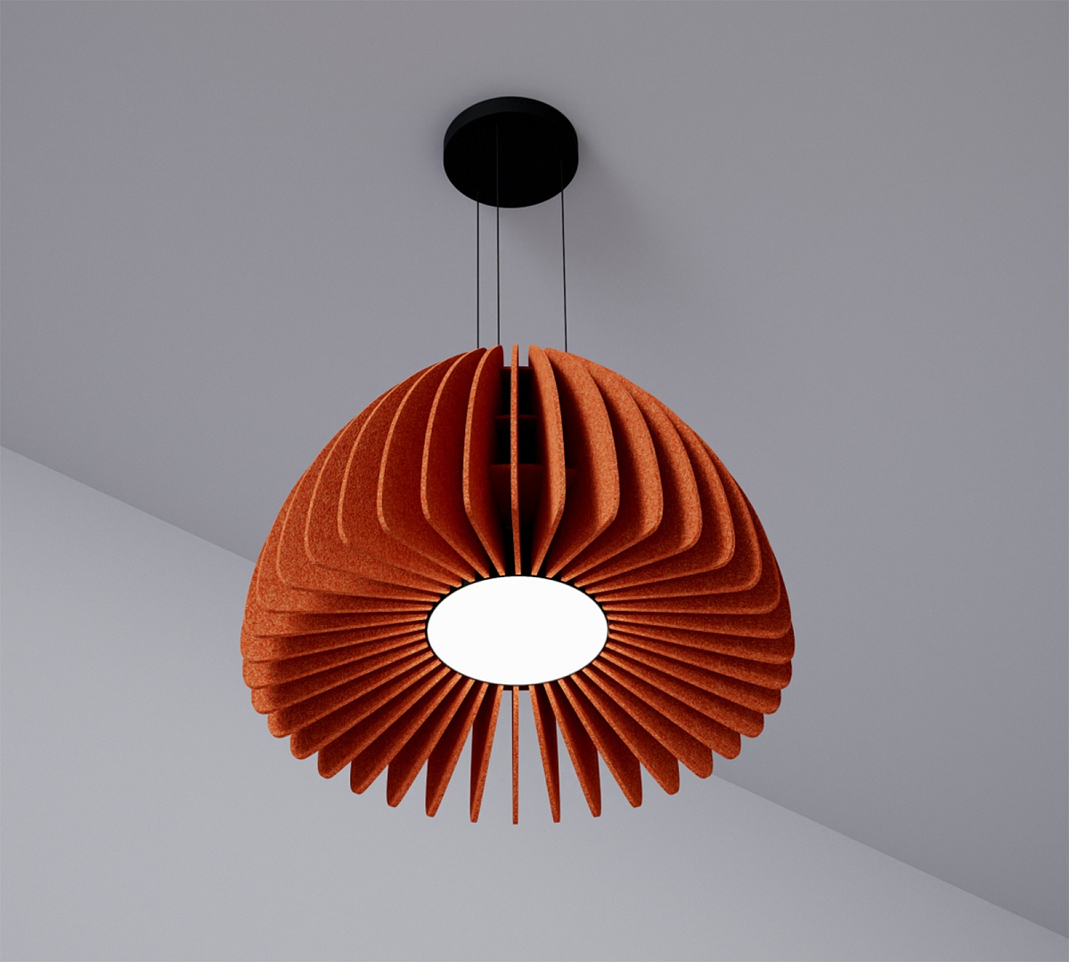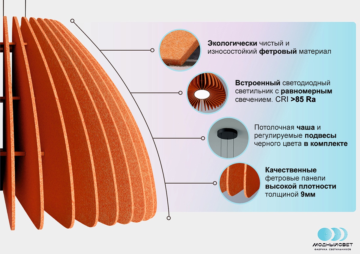 Подвесной светильник MODALINE ROUND BELL90 – это элегантное и функциональное решение для освещения вашего интерьера. Уникальный абажур, собранный вручную из мягких фетровых панелей, создает теплую и приглушенную атмосферу, рассеивая свет мягко и равномерно. Фетр не только приятен на ощупь, но и обладает отличными звукопоглощающими свойствами, что способствует созданию более комфортной акустической среды в помещении.