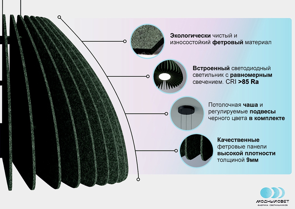 Подвесной светильник MODALINE ROUND BELL90 – это элегантное и функциональное решение для освещения вашего интерьера. Уникальный абажур, собранный вручную из мягких фетровых панелей, создает теплую и приглушенную атмосферу, рассеивая свет мягко и равномерно. Фетр не только приятен на ощупь, но и обладает отличными звукопоглощающими свойствами, что способствует созданию более комфортной акустической среды в помещении.