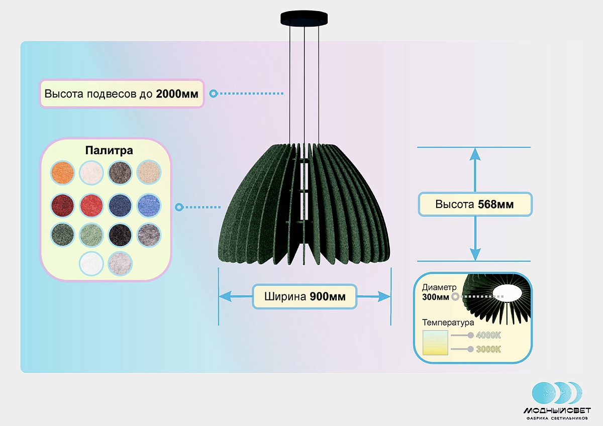 Примечание Абажур из фетровых панелей. Широкая палитра. Есть возможность переключения мощности/яркости на источнике питания. Источник питания в комплекте