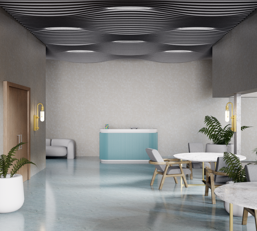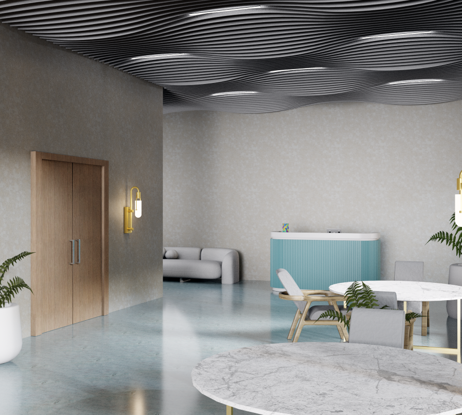 ➤ Особенностью данного потолка является возможность интеграции светодиодных изогнутых светильников, повторяющих плавные линии волны. Это позволяет создать неповторимые световые эффекты, подчеркивающие объем и текстуру потолка.