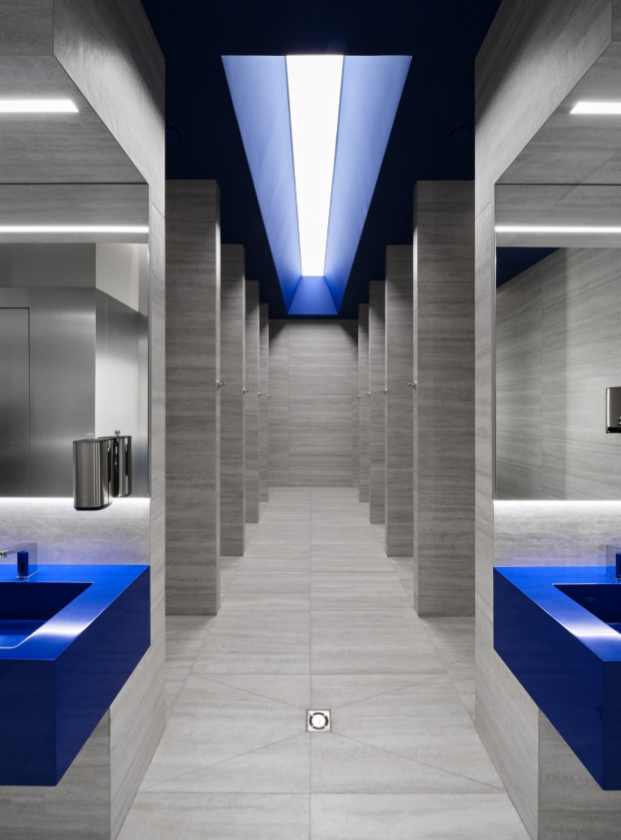 Пространства украшены геометрическими композициями, светильниками-трубами и габаритными единичными экземплярами.